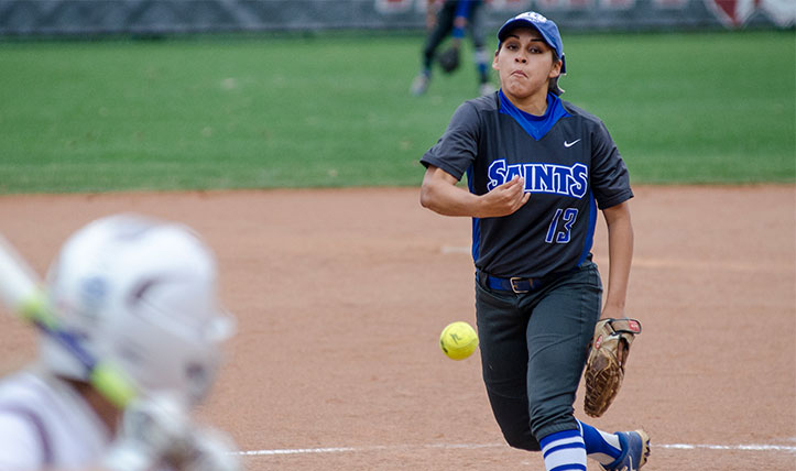 OLLU Saints softball player throws the ball during a past game.