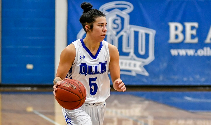 Saints women’s basketball player dribbles the ball during a recent game.